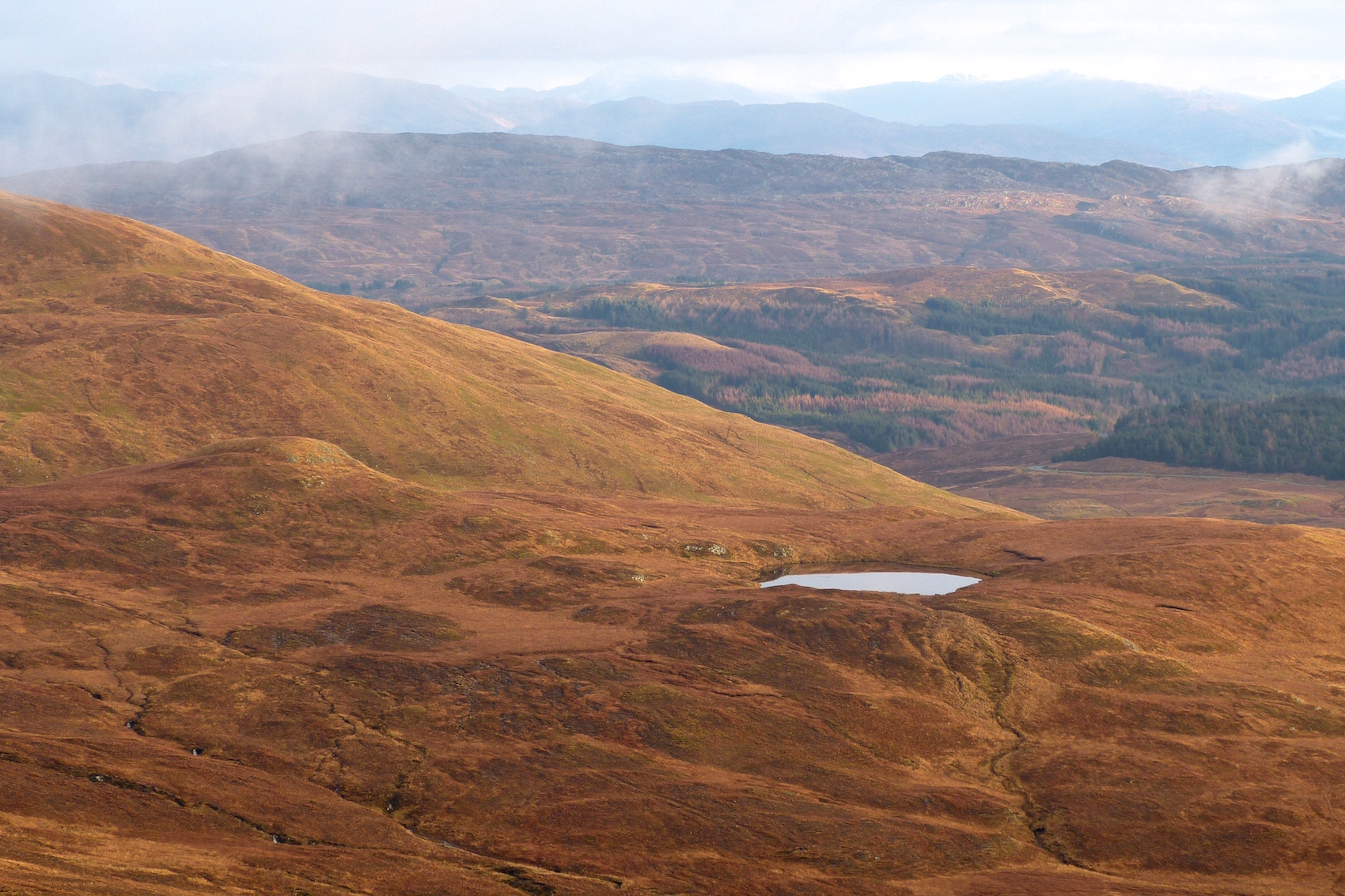 This picture was taken on Christmas Day from the summit of Meall an Tarmachain, ptarmigan hill, looking almost due east. The lochan is Lochan Tom Mhic Iain, and the small, lumpy hill to its...